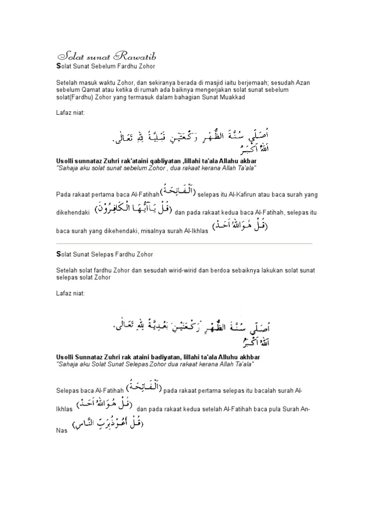 Rasulullah saw shalat dua rakaat sebelum dan sesudah zhuhur dua. Barang siapa yang melakukan solat sunat di. Ini sama seperti dengan cara mengerjakan solat subuh hanya niatnya yang berbeza.